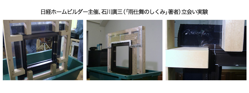 以下は、サッシ回りの防水テープの施工状態により雨水浸入実験です。防水テープにほんのわずかの段差があっても水は即浸入します。