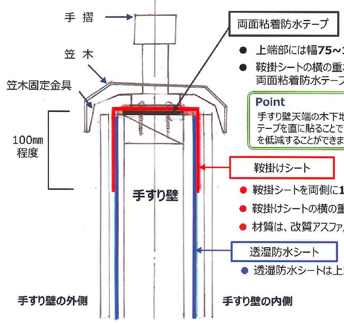 2次防水の性能向上と防水施工を安全確実に行うための「取合い防水シート」の位置付けですが、不必要なものなら施工しません。必要だからこそわざわざコストと手間をかけて施工するのです。先張り防水シートは、改質アスファルトフェルト・ルーフイング等の材料を使用し、誰がどのように施工するかを決めておかなければなりません。